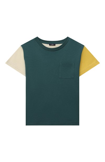 Для пошива разноцветной футболки мастера марки использовали мягкое джерси кремового, изумрудно-зеленого и горчичного оттенков. Изделие из такого материала не раздражает и не перегревает кожу и не мешает свободно двигаться, поэтому в нем будет комфортно весь день.