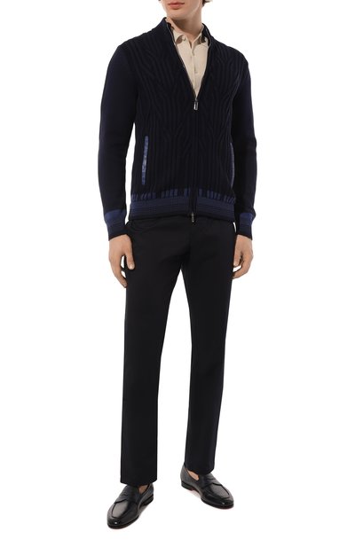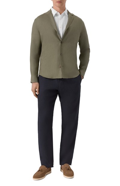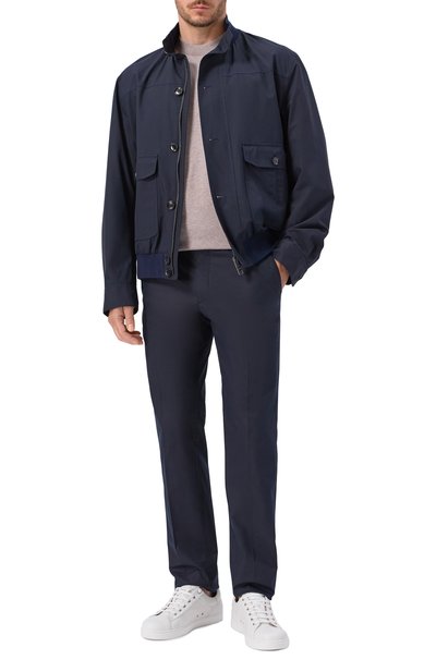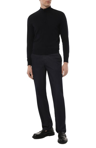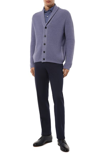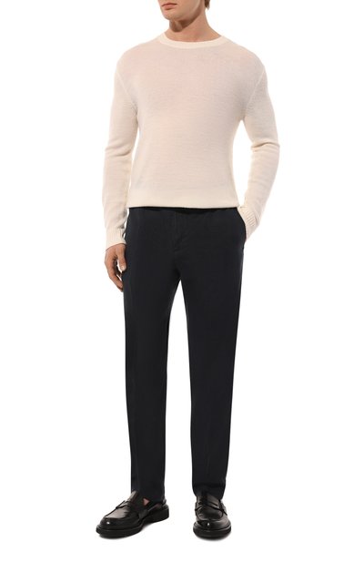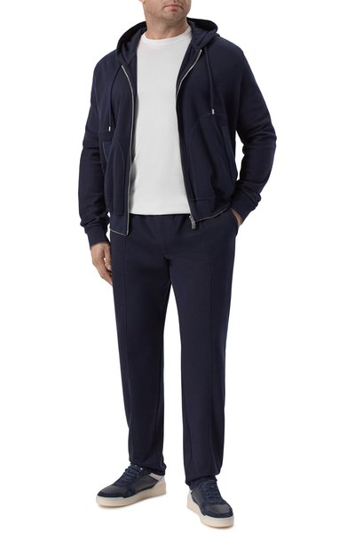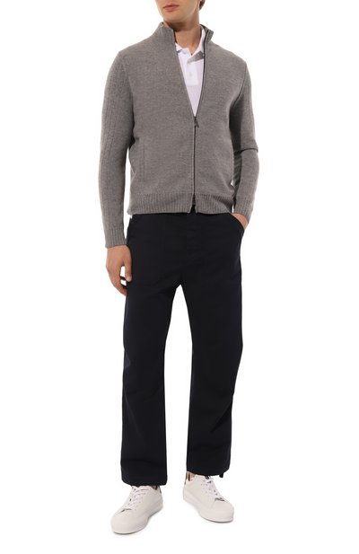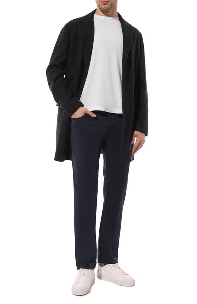Для создания брюк использовали хлопковый трикотаж с добавлением нитей эластана. Модель прямого кроя дополнили эластичным поясом и прорезными карманами.