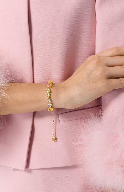Узкий браслет оттенка фуксии мастера марки вручную сплели из прочного хлопкового шнура. На концах модели со скользящим узлом закрепили блестящие круглые эглеты. О принадлежности аксессуара марке говорит декор в виде знаковых шипов-пирамид из полированного ювелирного сплава с гальваническим покрытием из 18-каратного золота.