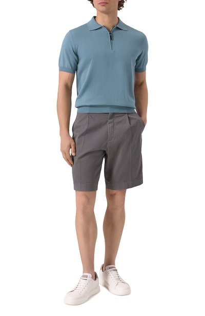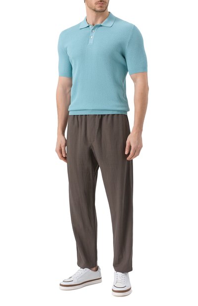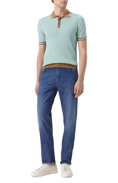 Поло изготовили фактурной вязкой из хлопковой пряжи. Эластичные манжеты, широкий пояс, отложной воротник в рубчик, а также нагрудную планку с тремя пуговицами выполнили в контрастном оттенке.