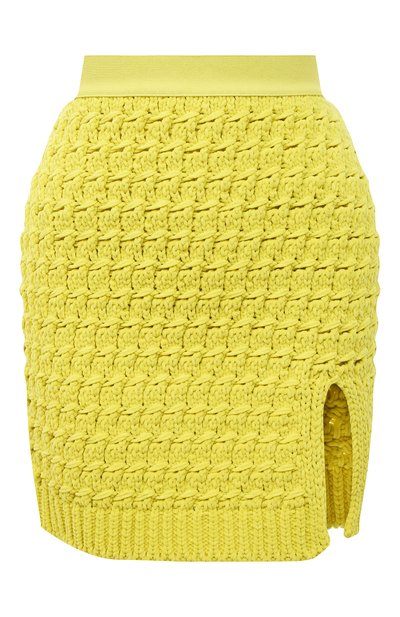 В круизной коллекции Дэниел Ли продолжил делать ставку на сочные оттенки, автоматически поднимающие настроение. Например, для этой мини-юбки с высокой посадкой и небольшим разрезом, еще выше открывающим ногу спереди, дизайнер выбрал насыщенный желтый (производитель назвал его Kiwi). Модель связали вручную фактурным эластичным узором из приятной на ощупь бархатистой синели, поэтому она слегка тянется и не сковывает шаг.