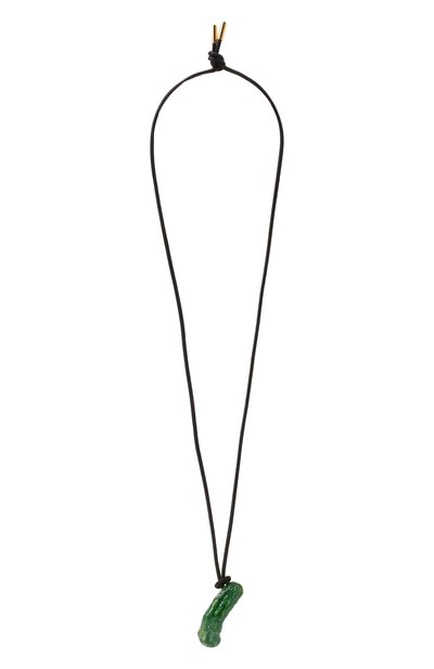 Кулону Cornichon, созданному вместе с британским скульптором Элис Андреа Юинг, под силу добавить иронии даже сдержанному образу. Все дело в нарочито неровной форме, которая безупречно копирует настоящий корнишон. Сходство с овощем усиливает зеленая эмаль, полностью скрывающая основу из ювелирного сплава. Украшение с логотипом марки на миниатюрной позолоченной пластине дополнено узким шнуром из мягкой черной кожи.