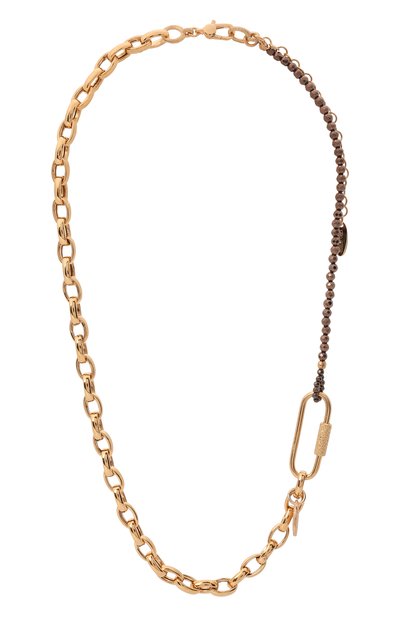 Это колье — яркий пример узнаваемой эстетики бренда, демонстрирующей сочетание вневременной элегантности, универсальности и непринужденности. Благородно мерцающая крупная цепочка цвета желтого золота переходит в тонкую нить из граненых гематитовых бусин с деликатным медным отливом. Элементы не спорят друг с другом, а создают единую мелодию, верхнюю ноту в которой берет фигурная деталь, заменившая кулон.