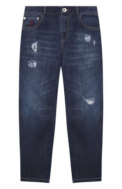 В темно-синих джинсах из гладкого плотного хлопка ребенку будет комфортно даже во время активных игр. Ткань хорошо пропускает воздух, а продуманный до мелочей крой не сковывает движения. Брюки с небольшими потертостями украшены небольшим красным логотипом марки.