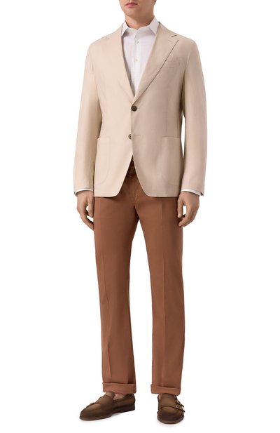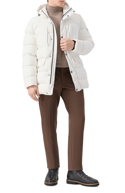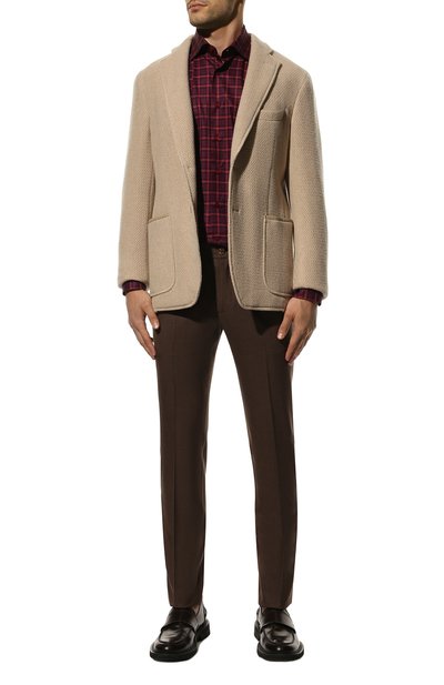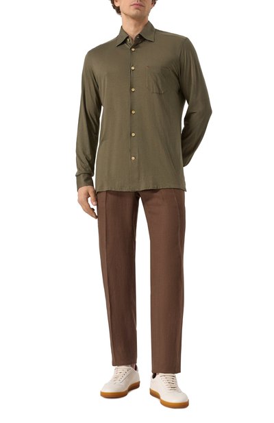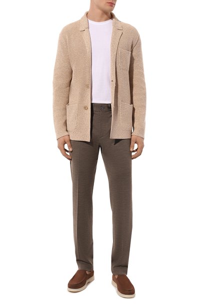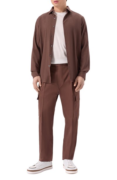Брюки шоколадного оттенка команда марки вывела на новый уровень комфорта. Представленную эксклюзивно в ЦУМе моде ль с эластичным поясом-кулиской выполнили из нежного кашемирового трикотажа. Пух для производства пряжи вручную вычесывают из подшерстка горных коз, отбирая самые тонкие волокна, поэтому изделие настолько легкое и мягкое, что почти не ощущается на теле.