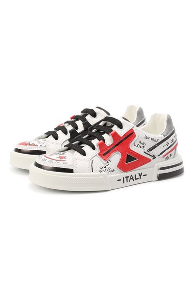 Кеды из линии Portofino Custom есть и во взрослой коллекции, поэтому их можно использовать для создания образа в стиле family look. Белая модель из мягкой матовой кожи притягивает взгляд надписями и рисунками, словно выполненными черным и красным маркерами. У пары есть секрет: светоотражающие детали делают ее особенно заметной в темноте.