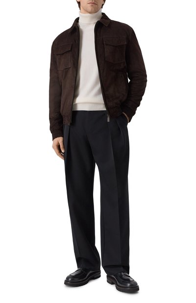 В весенне-летнюю коллекцию вошла прямая куртка насыщенного кофейного оттенка. Для пошива модели с отложным воротником использовали мягкую замшу из кожи ягненка. Благодаря кропотливой ручной выделке материал стал легким, тонким и пластичным, но не потерял прочность, поэтому изделие комфортно садится по фигуре. Вещь дополнили большими накладными карманами с клапанами на пуговицах.
