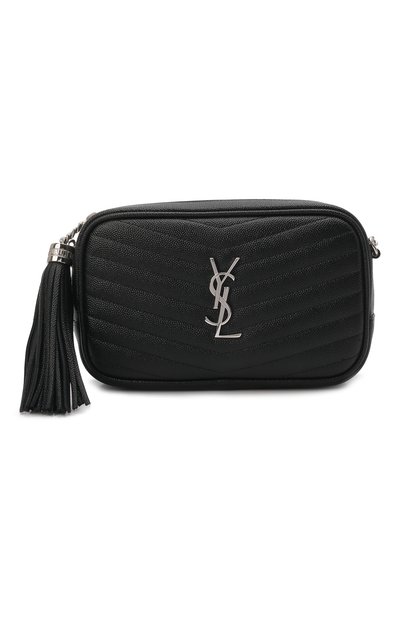 Аксессуары линии Lou легко узнать по стеганому шевронному мотиву и аграфу в виде знаковой монограммы Кассандра из инициалов Ива Сен-Лорана. Не стала исключением и небольшая черная сумка из весенне-летней коллекции. Для изготовления модели использовали блестящую фактурную кожу. Из такого же материала выполнили объемную длинную кисточку на пуллере и мягкую вставку на серебристом ремне-цепочке. В изделие поместятся смартфон, кошелек и ключи.