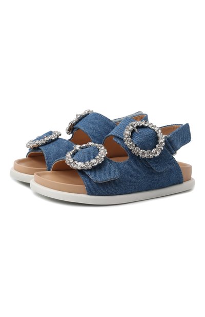 Мастера марки выполнили синие сандалии из мягкого, но прочного денима. Благодаря трем регулируемым ремешкам велькро обувь плотно облегает стопы, не сдавливая и не натирая. За комфорт при ходьбе отвечает упругая подошва с анатомической стелькой, учитывающей особенности детской ноги. Союзку декорировали крупными круглыми пряжками, инкрустированными сверкающими кристаллами.