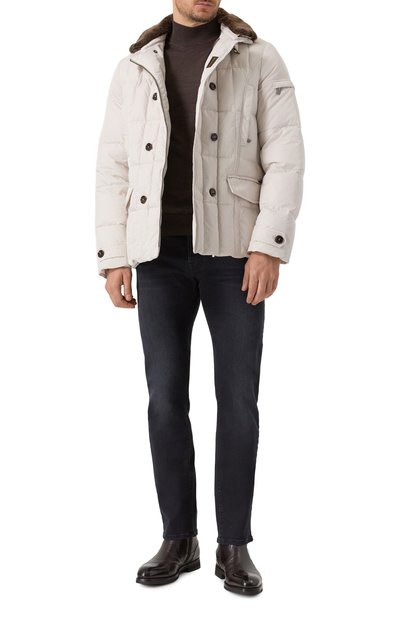 Эти джинсы из весенне-летней коллекции поддержат бунтарский дух косухи в образе total black. Дело не только в черном цвете, но и в зауженном крое, который не сковывает движения благодаря эластичному японскому дениму. Белые швы на задних карманах подчеркивают лаконичность модели и перекликаются с геометричным принтом на небольшом платке.