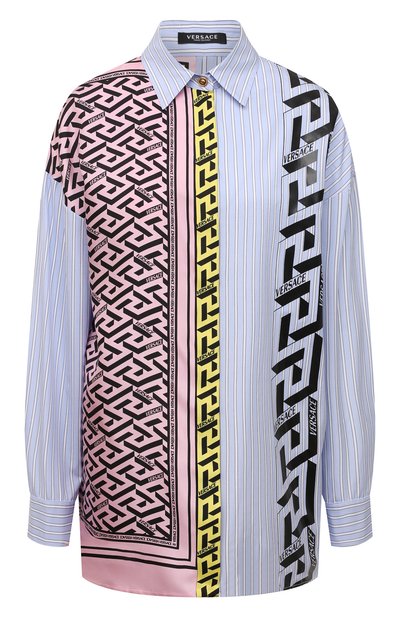 Рубашку из круизной коллекции сезона весна-лето Донателла Версаче словно перекроила из нескольких вещей — мужской сорочки и двух блуз. Такую ассоциацию дизайнер марки искусно сформировала принтами: сдержанная полоска слегка усмиряет яркость розового и желтого мотива La Greca. С ним безукоризненно рифмуется рисунок Greek Key, растянутый вдоль левой части вещи из красиво струящегося шелка.