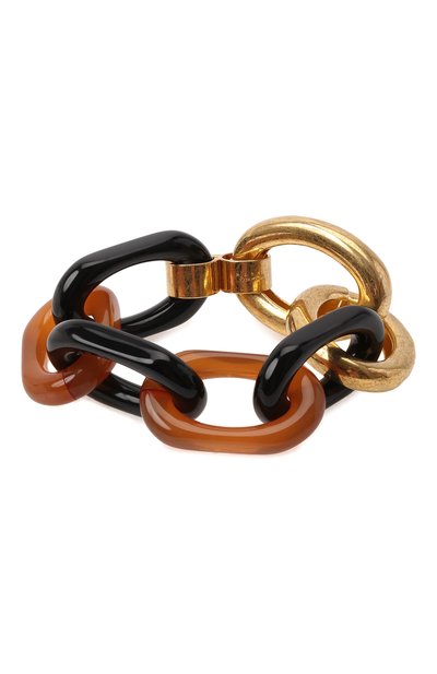 Широкий объемный браслет, как эта модель в виде цепочки с крупными овальными звеньями, – идеальный способ подчеркнуть тонкое запястье. Для изготовления аксессуара мастера марки использовали ювелирный сплав с патинированным золотым покрытием и эпоксидную смолу черного и медового оттенков. Изделие застегивается замком-зажимом с выгравированным логотипом.