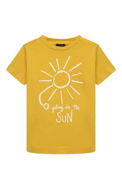 Желтую футболку с круглым вырезом сшили из приятного на ощупь, гладкого хлопкового джерси. Гипоаллергенный материал позволяет коже ребенка дышать, а прямой крой не ограничит самые активные движения. Модель декорировали белым графичным принтом в виде солнца с электрическим шнуром и надписью «Plug in the sun».