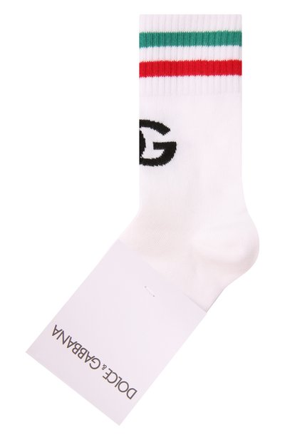 Белые высокие носки с черной жаккардовой DG-монограммой на паголенке спереди связали из особенно мягкой и нежной хлопковой пряжи, которая хорошо пропускает воздух. Чтобы аксессуар не деформировался, в ее состав добавили нейлон и эластан. Широкую манжету, не пережимающую сосуды, украсили полосками в цветах итальянского триколора.