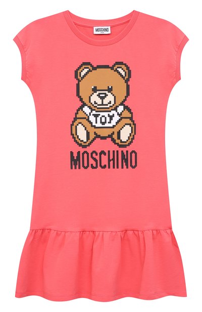 Ярко-коралловое платье напоминает комплект из базовой футболки и расклешенной мини-юбки. Именно задрапированный волан по краю вещи задает такую ассоц иацию и делает модель наряднее. На максимум игривое настроение изделия из нежного хлопка выводит красочный рисунок в виде персонажа Teddy Bear.