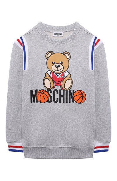 Меланжево-серый свитшот с полосатыми манжетами и вставками на плечах сшили из мягкого хлопкового трикотажа, который хорошо пропускает воздух и комфортно облегает тело. Фактурная изнанка удерживает тепло и не раздражает нежную кожу ребенка. Свободную модель украсили фирменным принтом Teddy Bear.