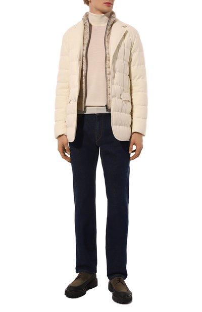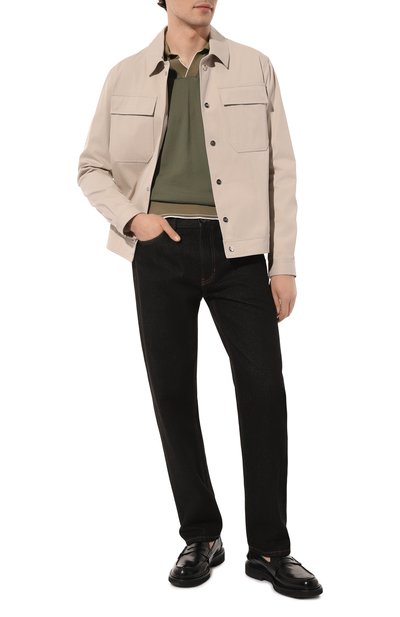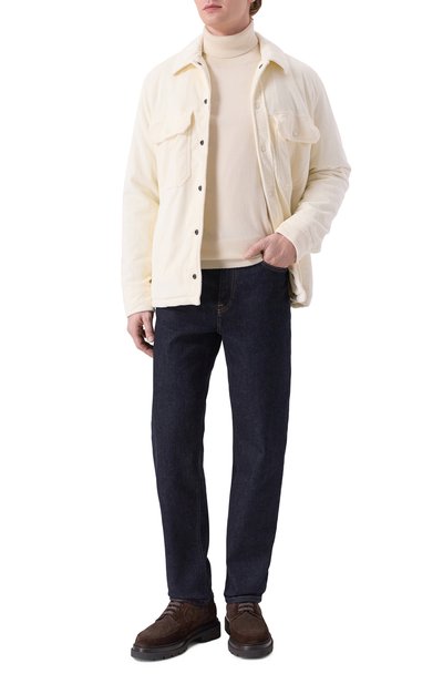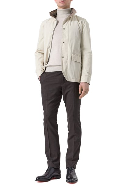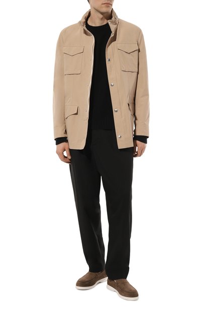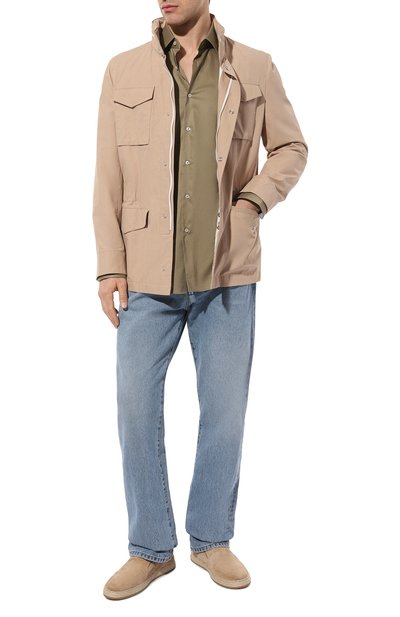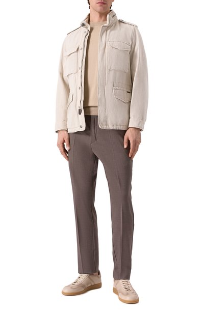 Кремовая куртка в стиле сафари – идеальный вариант для прохладных летних дней в городе. Для пошива модели с двумя парами больших накладных карманов мастера марки, основанной Пьетро Лоро Пьяна, использовали плотную хлопковую ткань с добавлением легкого дышащего льна, обработанного для дополнительной мягкости. Изделие с потайной кулиской на поясе застегивается пуговицами, скрытыми под широкой планкой.