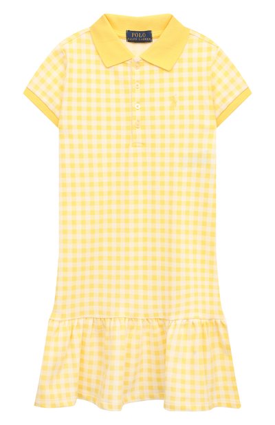 Желтое платье-поло из мягкого эластичного хлопка пике в клетку хорошо впитывает влагу и пропускает воздух, поэтому в нем ребенку будет комфортно даже в самые жаркие дни. Модель с заниженной линией талии и короткими рукавами украшена вышитым игроком в конное поло.