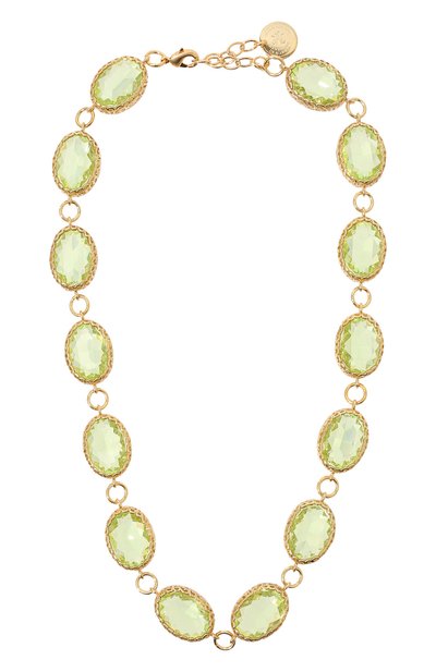 Светло-зеленое колье напоминает старинное украшение. Такой эффект создает ажурная оправа, в которую заключили овальные многогранные кристаллы. Для изготовления аксессуара мастера марки использовали легкий ювелирный сплав с 22-каратным золотым напылением.
