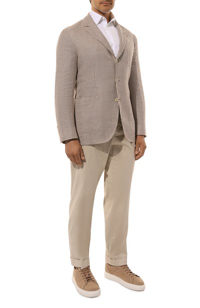 Бежевый пиджак в клетку «принц Уэльский» скроен без подклада, поэтому у него почти такой же мягкий силуэт, как у кардигана. Высокие шлицы сзади делают посадку еще комфортнее, а в меру плотный лен соперн ичает с трикотажем в легкости и способности пропускать воздух. Чтобы материал стал нежнее, мастера марки, основанной семьей Зенья, соединили его с отборной тонкой шерстью и гладким шелком.