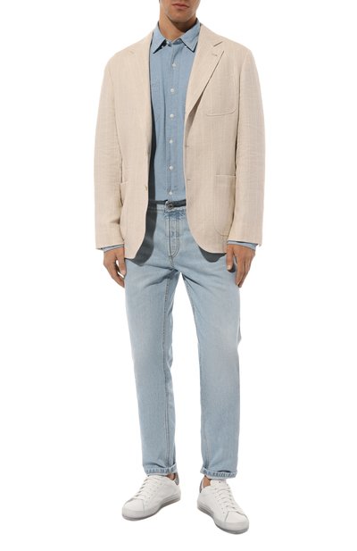 Бежевый пиджак в клетку «принц Уэльский» скроен без подклада, поэтому у него почти такой же мягкий силуэт, как у кардигана. Высокие шлицы сзади делают посадку еще комфортнее, а в меру плотный лен соперничает с трикотажем в легкости и способности пропускать воздух. Чтобы материал стал нежнее, мастера марки, основанной семьей Зенья, соединили его с отборной тонкой шерстью и гладким шелком.