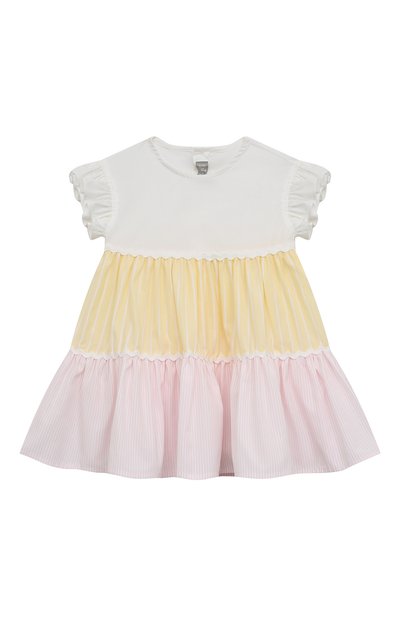 Мастера марки выполнили свободное платье из мягкого тонкого хлопка, который хорошо пропускает воздух и практически не ощущается на коже. Широкие оборки на рукавах гармонично сочетаются с разноцветным полосатым подолом. Вещь застегивается пуговицами сзади.