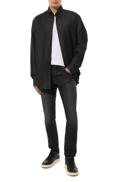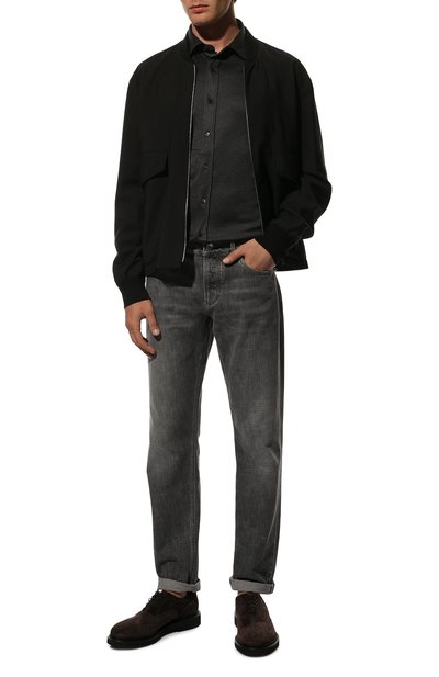 Серая рубашка с отложным воротником и длинными рукавами одинаково гармонично будет смотреться и с джинсами, и с офисным костюмом. Градус формальности модели снижает материал, который в то же время делает ее максимально комфортной. Для создания изделия использовали тонкий стрейчевый трикотаж из нежного шелка и мягкого дышащего хлопка.