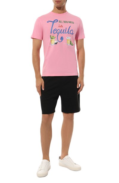 Светло-голубую футболку с круглым вырезом выполнили из тонкого хлопкового джерси, которое хорошо пропускает воздух и не ограничивает свободу движений. Спереди модель украсили разноцветным акварельным принтом с изображением коктейля и ироничной надписью. На левом рукаве — логотип марки.