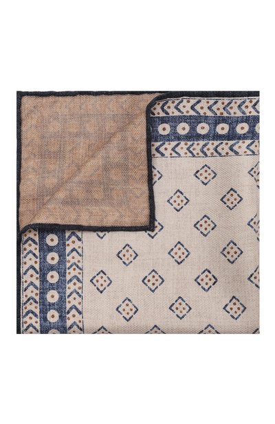 Для изготовления бежевого платка использовали мягкую ткань, сотканную на фабрике в Соломео. Материал из длинных волокон шелка не требует особенного ухода, а набивной графичный узор в синих тонах не теряет яркость со временем. Чтобы квадратное паше сохраняло форму, края подшили эластичным швом.