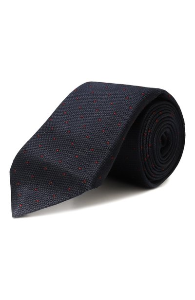 Этот галстук из фактурного шелкового жаккарда поможет довести формальный образ до совершенства. Плотная ткань делает силуэт аксессуара четким, предельно темный оттенок синего задает строгий тон, который ничуть не становится более легкомысленным от мелкого алого гороха. Команда марки выбрала для аксессуара правильную ширину, поэтому он поладит и с узкими, и с увеличенными лацканами пиджака.