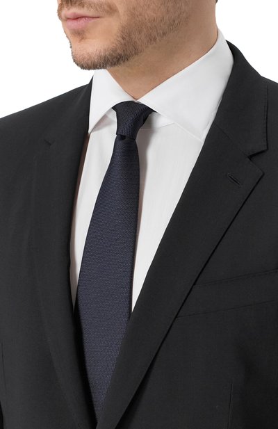 Однотонный галстук выполнили из шелкового твила. Чтобы аксессуар средней ширины хорошо сохранял форму, его дополнили подкладом и сложили нескольк о раз.
