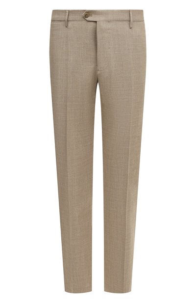 Эти брюки меланжевого бежевого оттенка команда марки адаптировала для теплой погоды облегченным костюмным материалом. В нем привычную шерсть смешали с шелковыми и льняными волокнами, поэтому изделие хорошо держит четкость стрелок, лучше классических аналогов пропускает воздух и меньше мнется. Наши стилисты предлагают поддержать расслабленный тон модели футболкой и лоферами на массивной подошве.