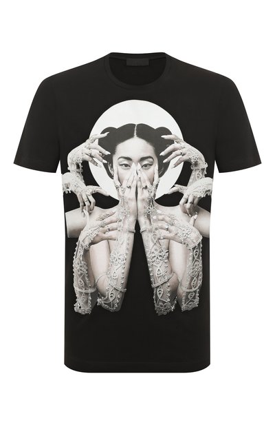 В гипнотичной многорукой фигуре на этой черной хлопковой футболке угадывается отсылка к индуистским божествам. Сходство с ними усиливают изображения массивных браслетов, оживленные аппликацией из кристаллов и узких цепей. Сзади блестящему декору вторит крупная фирменная эмблема, вспыхивающая в лучах света.