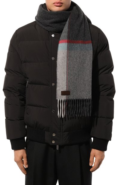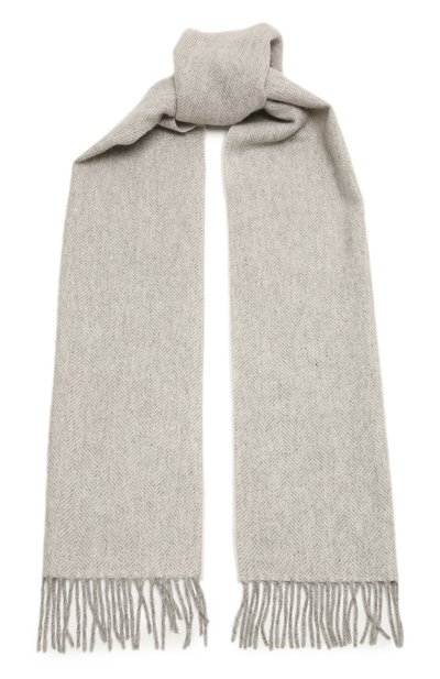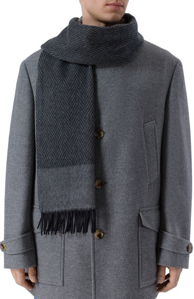 Широкий шарф с геометрическим узором выполнили из твила на основе шерсти с добавлением кашемира. Концы аксессуара декорировали короткой бахромой.