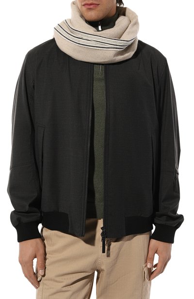 Шарф с короткой бахромой на концах выполнили из чистого кашемира. Края аксессуара подчеркнули контрастным кантом в цветную полоску.