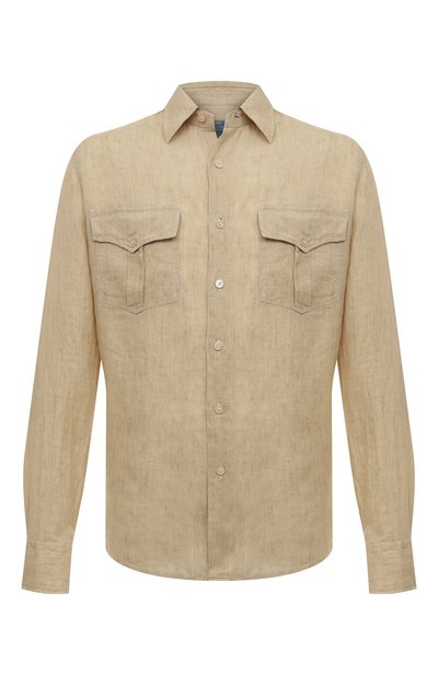 Мастера марки, основанной Алессандро Герарди, использовали для пошива бежевой рубашки легкий лен, который не просто хорошо пропускает воздух, но и немного охлаждает кожу в жару. Материал с неоднородной жатой фактурой сделал модель выразительнее, как и два нагрудных кармана с фигурными клапанами.