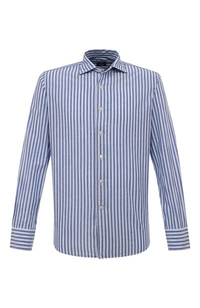 Мастера марки, основанной Алессандро Герарди, сшили приталенную рубашку с длинными рукавами и воротником кент из плотного материала на базе хлопка. Благодаря льну в составе ткань лучше дышит, а вертикальные синие и голубые полоски на ней выглядят выразительнее.