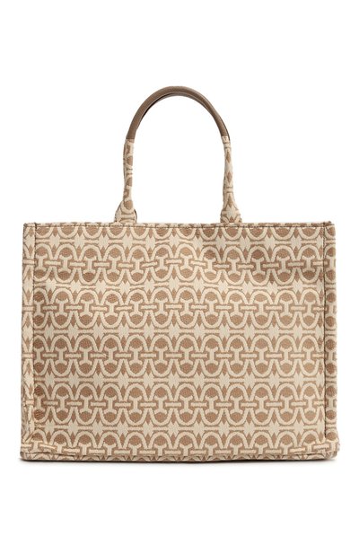 Создавая сумку Never Without, дизайнеры бренда особое внимание уделили материалу. Лаконичный прямоугольный силуэт воплотили в плотной жаккардовой ткани со сложным рисунком в кофейно-молочных тонах. Текстиль дополнительно обработали с обеих сторон, чтобы он стал особенно прочным, не пропускал влагу и меньше боялся грязи. Внутрь поместятся бумаги формата А4, планшет, кошелек и ключи.