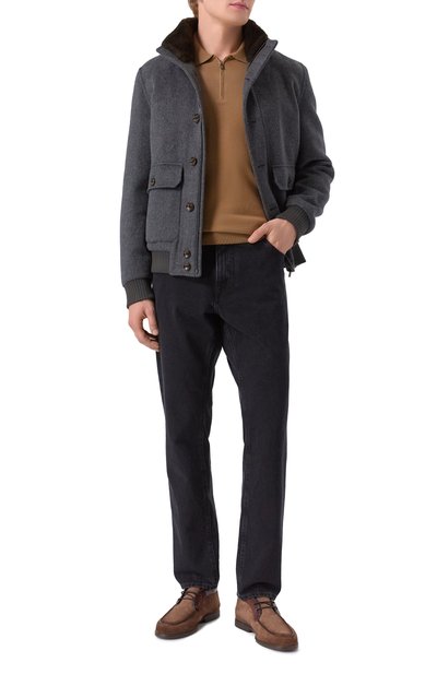 Коричневые ботинки с объемным швом на союзке мастера марки, основанной Джоном Ричардсоном Барреттом, сшили из мягкой бархатистой замши, а для отделки голенища использовали крупнозернистую кожу с матовым блеском. Верх соединили с легкой рельефной подошвой вручную по фирменной технологии, поэтому о бувь адаптируется к форме стопы.