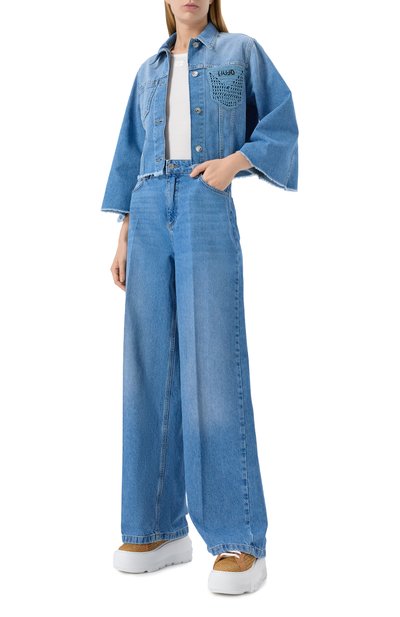 Голубые расклешенные джинсы словно обрезали вручную, оставив необработанными края. С ними перекликаются небольшие потертости на карманах. Для пошива модели с высокой посадкой мастера марки использовали мягкий плотный хлопок с эффектом делаве и светлыми заломами.