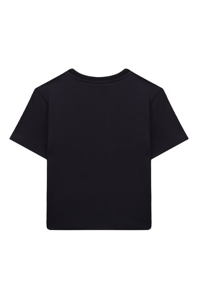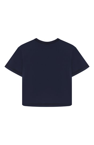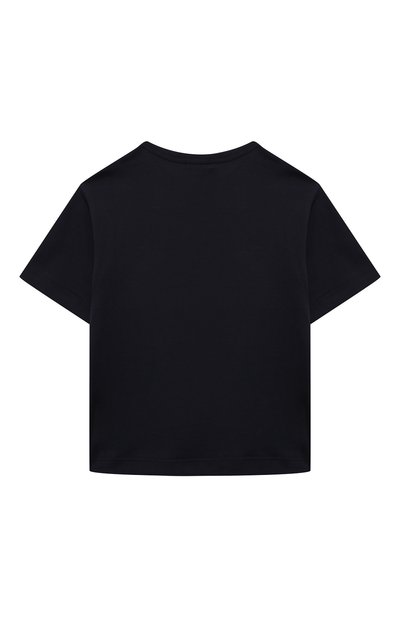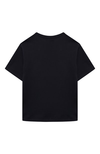 Темно-синяя футболка с круглой горловиной и короткими рукавами сшита из тонкого премиального хлопка джерси с шелковистой гладкой поверхностью. Эластичный материал не пилингуется, а одежда из него отлично пропускает воздух и не сковывает движения. Модель украшена спереди белой надписью и логотипом марки.