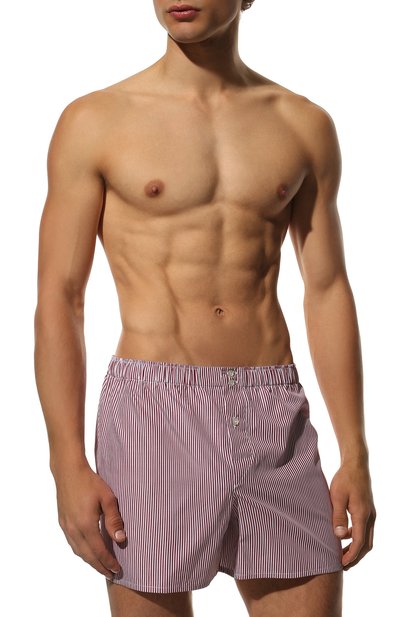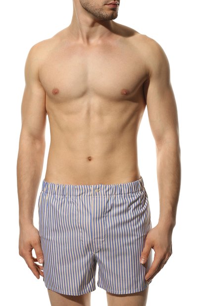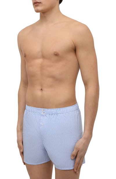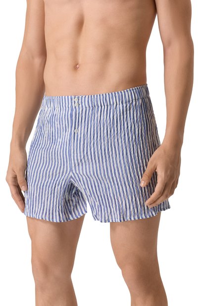 В этих боксерах будет комфортно весь день: свободный крой модели не сковывает движения, а нежнейший хлопковый поплин в бело-голубую вертикальную полоску приятно ощущается на теле и хорошо пропускает воздух. Трусы с заниженной посадкой и широким эластичным поясом застегиваются пуговицей.