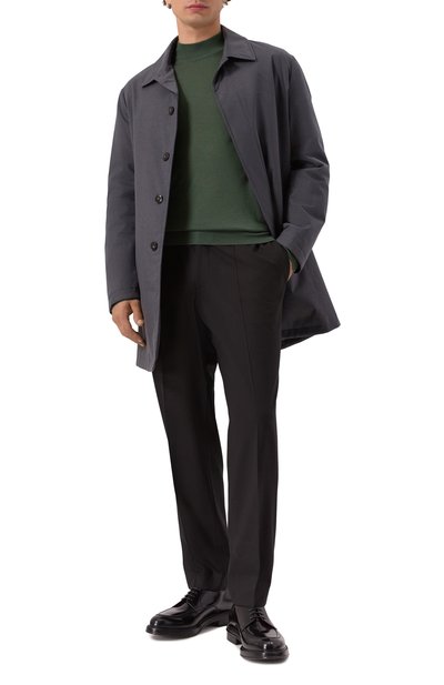 Зеленый джемпер хорошо работает с вещами в любой цветовой гамме. Например, наши стилисты сочетали его с синими джинсами и бежевым пальто, а завершили образ черными лоферами. Для создания модели с высоким воротом использовали тончайшую кашемировую пряжу, усиленную нитями нежного шелка, поэтому в ней будет комфортно весь день.