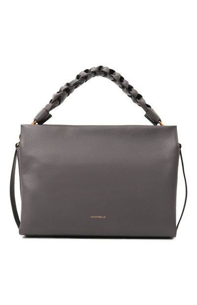 Серую сумку Boheme со строгим прямоугольным силуэтом сшили из прочной и одновременно мягкой кожи с крупным тиснением. Полосы такого же приятного на ощупь материала переплели в характерной широкой ручке. Фактурная деталь пристегнута карабинами к небольшим боковым кольцам, украшенным узкими лентами. В аксессуар со съемным плечевым ремнем поместятся складной зонт, планшет, кошелек и смартфон.