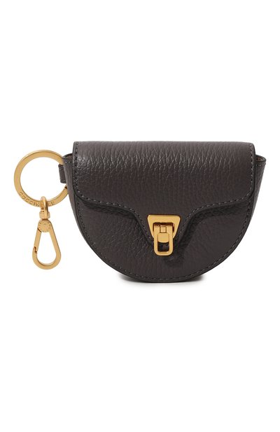 Небольшой темно-серый футляр для ключей мастера бренда сшили из матовой крупнозернистой кожи. Клапан закрывается золотистым замком в виде знакового плектра. Эту деталь, а также кольцо и карабин выполнили из прочного сплава.
