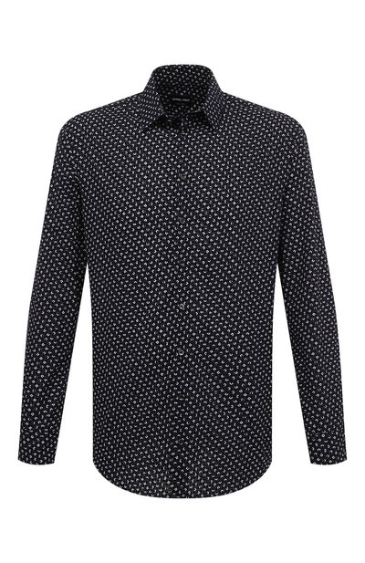 Синюю рубашку с длинными рукавами и воротником кент сшили из тонкого набивного хлопка. Материал с белым геометрическим паттерном, подчеркнутым флокированными деталями, почти не мнется и хорошо пропускает воздух. На показе такую модель сочетали с меховой курткой, свободными брюками и высокими ботинками, а наши стилисты предлаг ают составить ансамбль с классическим костюмом и кедами.