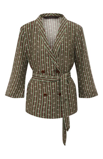 Ульяна Сергеенко придала зелено-коричневой рубашке с укороченными рукавами черты двубортного жакета. Спереди дизайнер расположила два ряда пуговиц, а отложному воротнику предпочла шалевый. Мастера бренда выполнили модель из тонкого шелкового жаккарда с наивными пасторальными мотивами. Такой же текстиль использовали дл я создания длинного пояса-ленты.