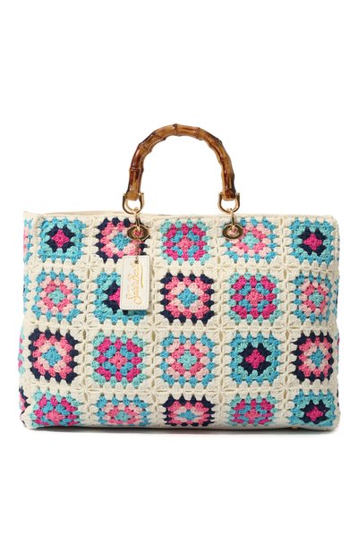 Кажется, будто разноцветную сумку с двумя короткими ручками мастера марки выполнили в технике пэчворк: такой эффект создает вязаный крупный узор. Для изготовления модели использовали мягкую прочную пряжу. Внутрь поместятся полотенце и шлепанцы, а для хранения ключей предусмотрели карман на молнии.