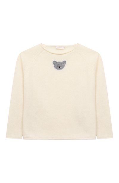 Кремовый пуловер с серым узором спереди согреет в холодные дни и будет почти неощутим на теле. Все дело в тонкой кашемировой пряже, которая намного теплее шерстяных аналогов, несмотря на легкость. Чтобы вязаная модель со слегка подворачивающимися краями не сковывала движения, ее силуэт сделали свободным и предусмотрели рукава реглан.