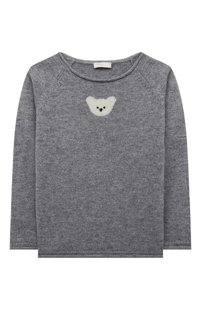 Пуловер с небольшим интарсионным узором в виде медвежонка выполнили из нежного кашемира. Чтобы материал стал особенно легким и приятным на ощупь, пух для создания пряжи вычесали вручную, а затем очистили специальным щипком, отобрав самые тонкие и длинные волокна. Края круглого выреза оставили необработанными, поэтому они слегка подворачиваются.